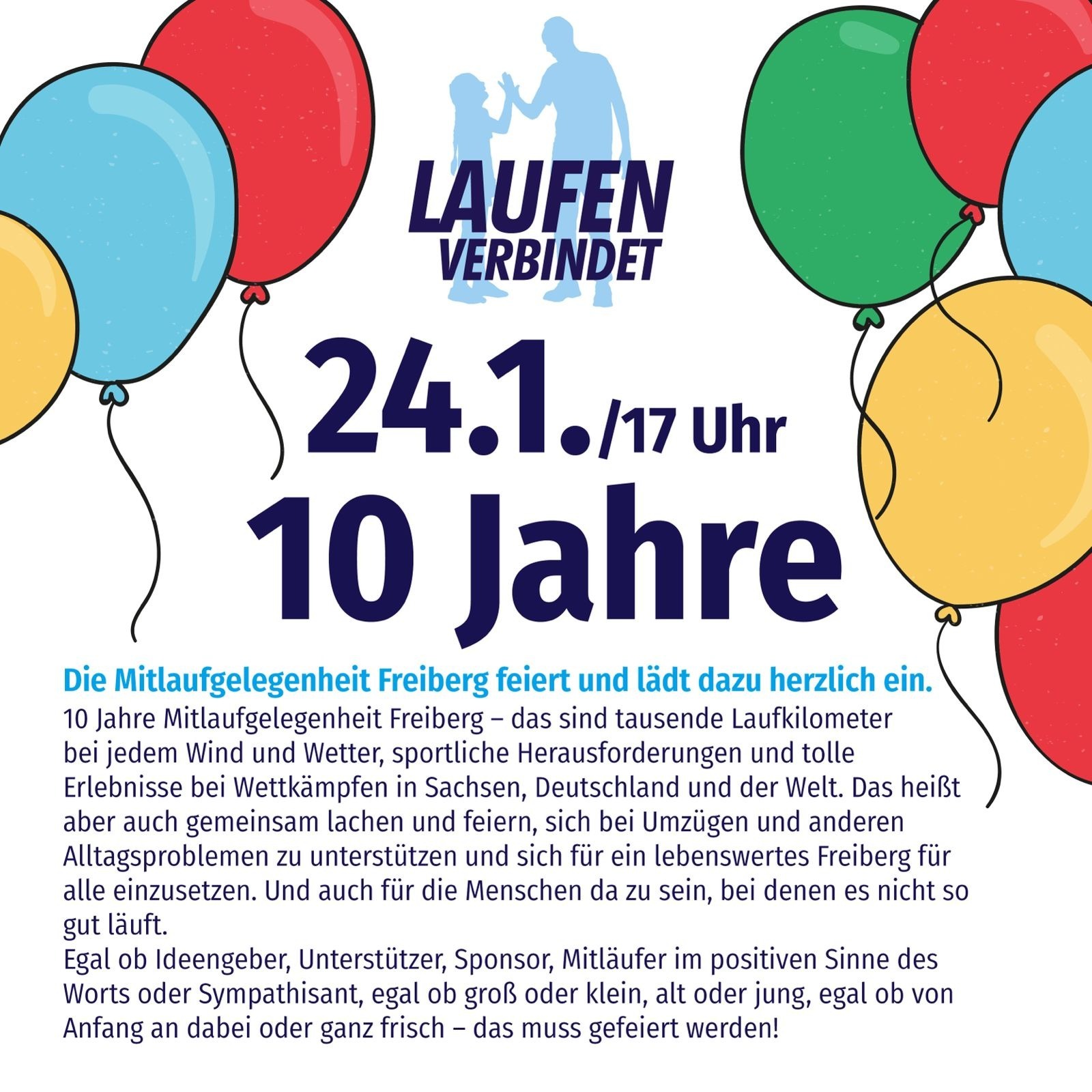 10 Jahre Mitlaufgelegenheit Freiberg – das sind tausende Laufkilometer bei jedem Wind und Wetter, sportliche Herausforderungen und tolle Erlebnisse bei Wettkämpfen in Sachsen, Deutschland und der Welt. Das heißt aber auch gemeinsam lachen und feiern, sich bei Umzügen und anderen Alltagsproblemen zu unterstützen und sich für ein lebenswertes Freiberg für alle einzusetzen. Und auch für die Menschen da zu sein, bei denen es nicht so gut läuft.